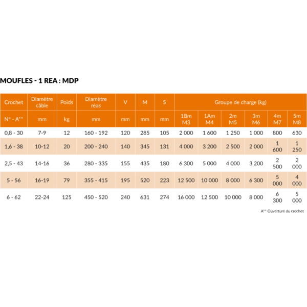Le mouke de pont roulant est composé d’un, de deux ou de trois réas – le diamètre de ceux-ci conditionne le choix de la référence. Basés sur les composants standards des poulies, ceux-ci sont adaptables pour la construction des moukes correspondants au classement FEM jusqu’au groupe M8.